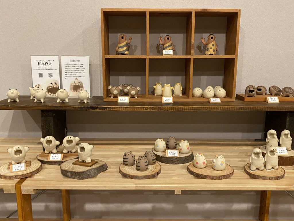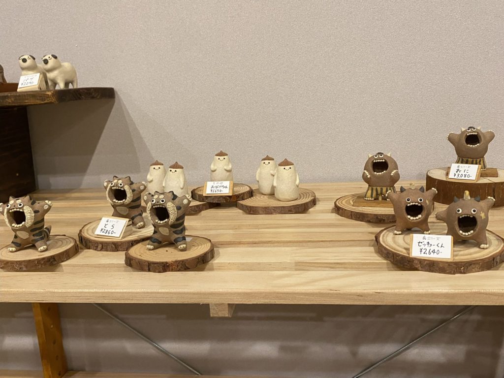 岐阜県中津川市の陶房上牧野で作陶する松本良太氏は、陶器小物クリチャーズ。 娘が大好きな作家さんです。豊橋での個展は初めてとのことですが、のんほいパークには来たことがあるそうです。「当店は、パン屋ですから販促に期待はしないで下さい。」とお声掛けの上、ギャラリー展示をしていただきました。しかし、かわいらしく愉快な作品を手に取られるお客様が何人もおられました。中には、九州福岡で1体目を購入し、もう一つ欲しいなあと思っていたところに、当店での個展開催を知り来店された方がおられてびっくりでした。またいつか、新しい作品を増やしギャラリー展示においでくださるのをお待ちしています。