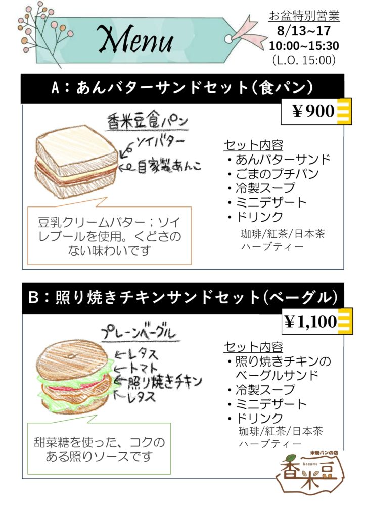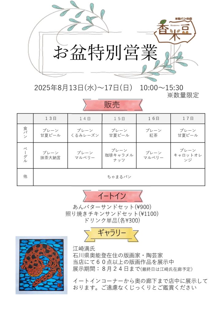 お盆の特別営業予定です。パンの販売と、イートインのサービスを行います。